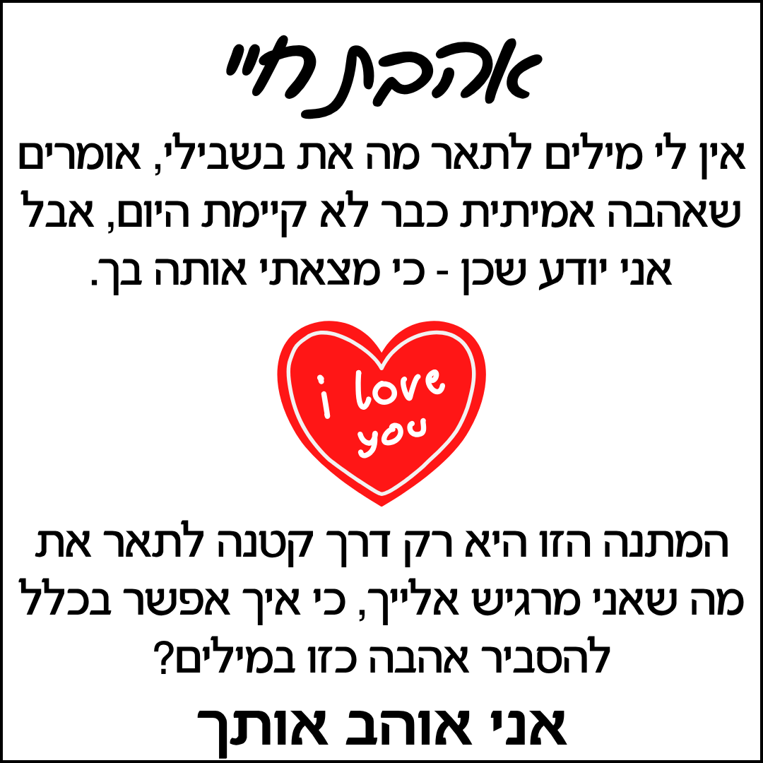 כל מילה בכרטיס נבחרה בקפידה כדי להזכיר לה שהיא לא רק האהבה שלך, אלא גם השותפה לחיים שלך.כשתקרא את הברכה, היא תרגיש את האהבה שלך, תחושת קרבה אמיתית ותזכור שתמיד יש לה מישהו שמחכה לה, תומך בה ואוהב אותה ללא תנאים.