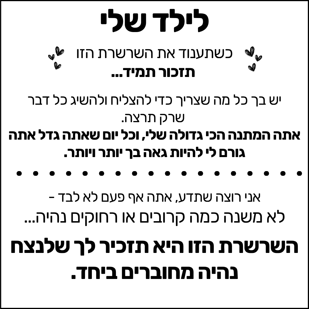 כשהוא יקרא את המילים שלך, הוא ירגיש כמה הוא מיוחד ואהוב, ויידע שתמיד יש לו מישהו שמאמין בו, תומך בו, ואוהב אותו בלי גבולות.